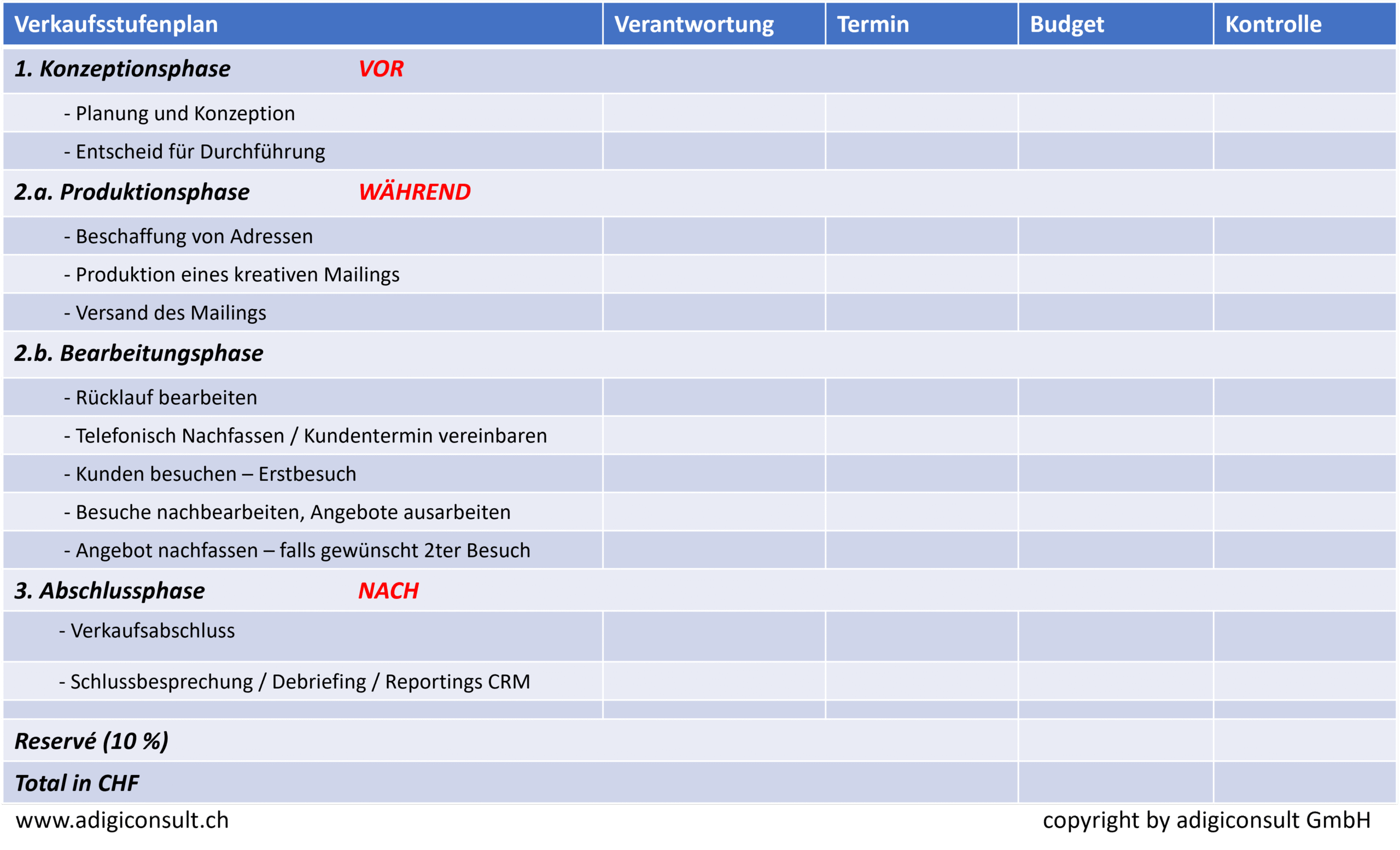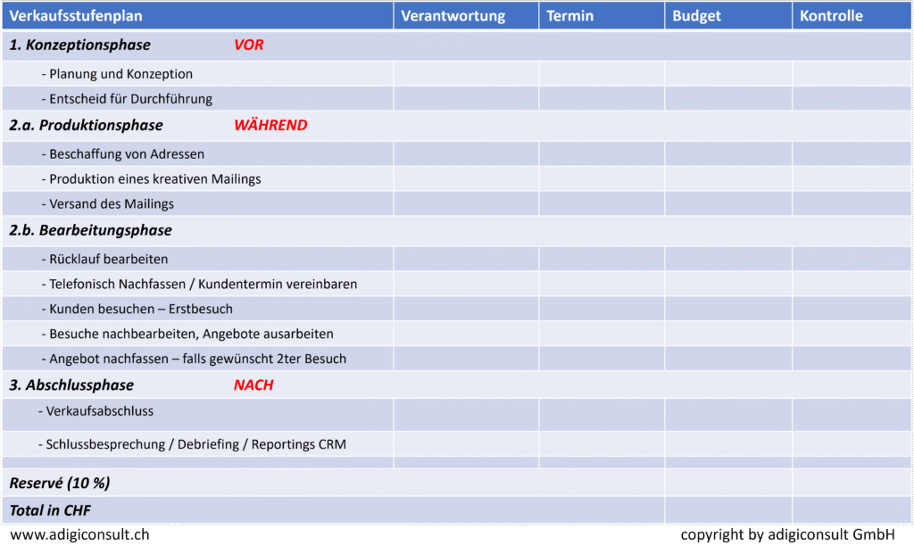 Der Verkaufsstufenplan definiert die Massnahmen, Verantwortlichkeiten, die Termine, das Budget und die Kontrollmassnahmen der einzelnen Schritte (Stufen).